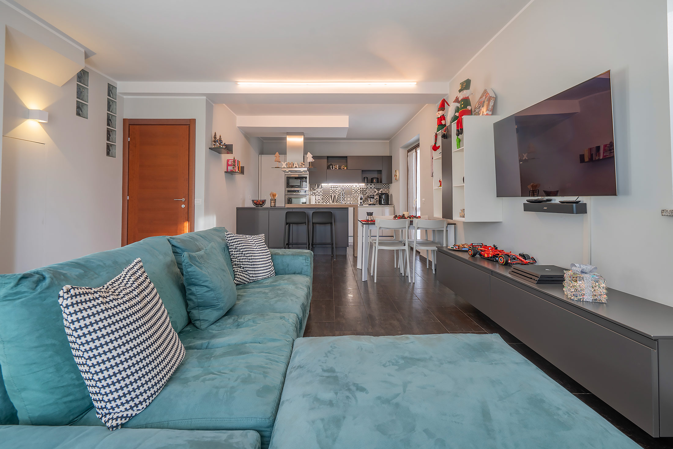 The entrance opens onto a spacious, bright, and perfectly organized living area—an open-plan space designed to be enjoyed at any time of the day. The layout is well balanced, with large openings that provide natural light throughout the day and lead out to a generous balcony overlooking Piazza Gallina: a true extension of the home, ideal for outdoor dining or simply soaking up the sun. A second, more private side balcony completes the outdoor space.